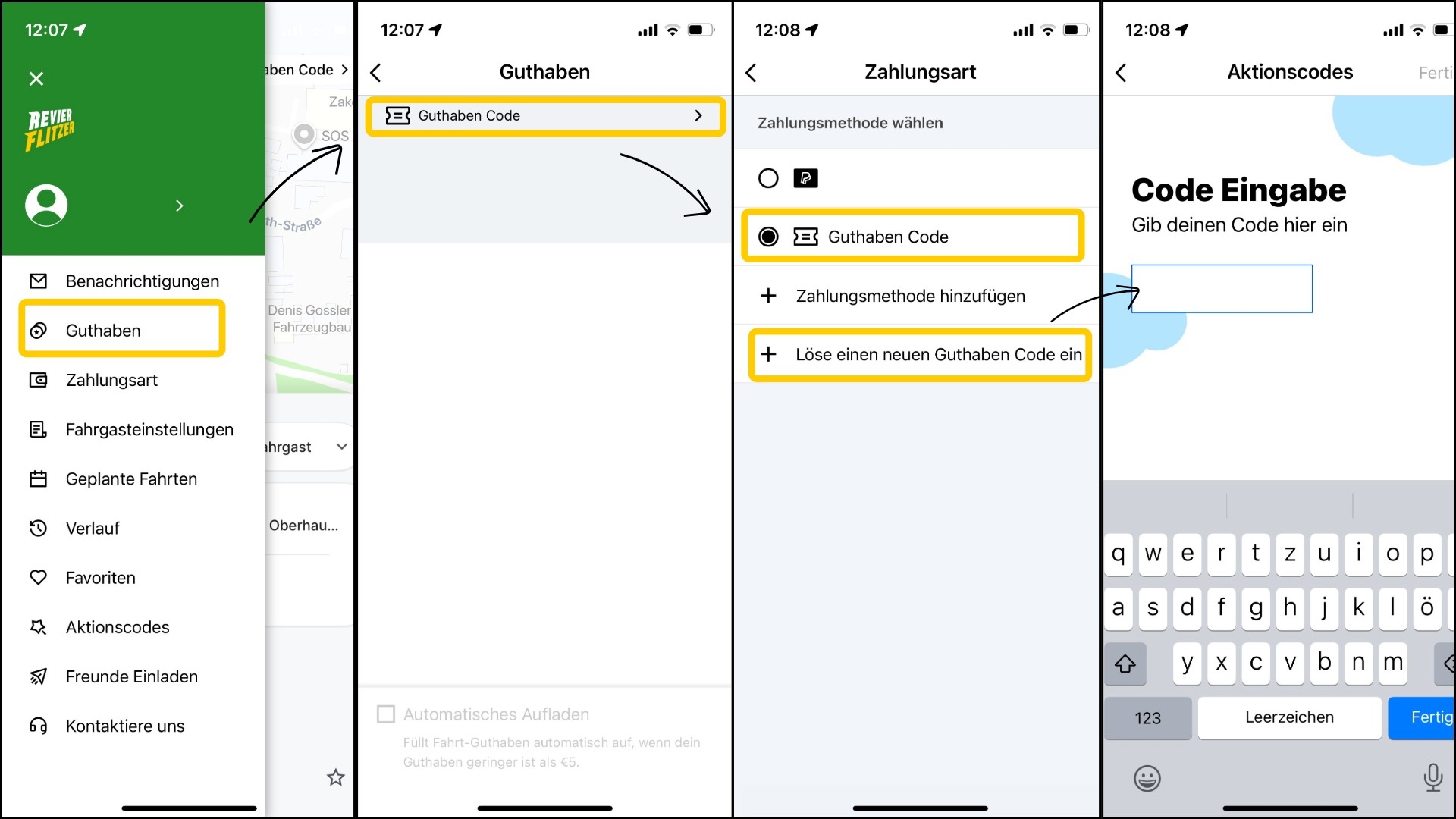 Sie können im KundenCenter Sterkrade Bahnhof oder im KundenCenter Hauptbahnhof Guthabenkarten zu je 10 € oder 25 € für den Revierflitzer® kaufen. Sie erhalten einen Code, den Sie in der App einlösen können.